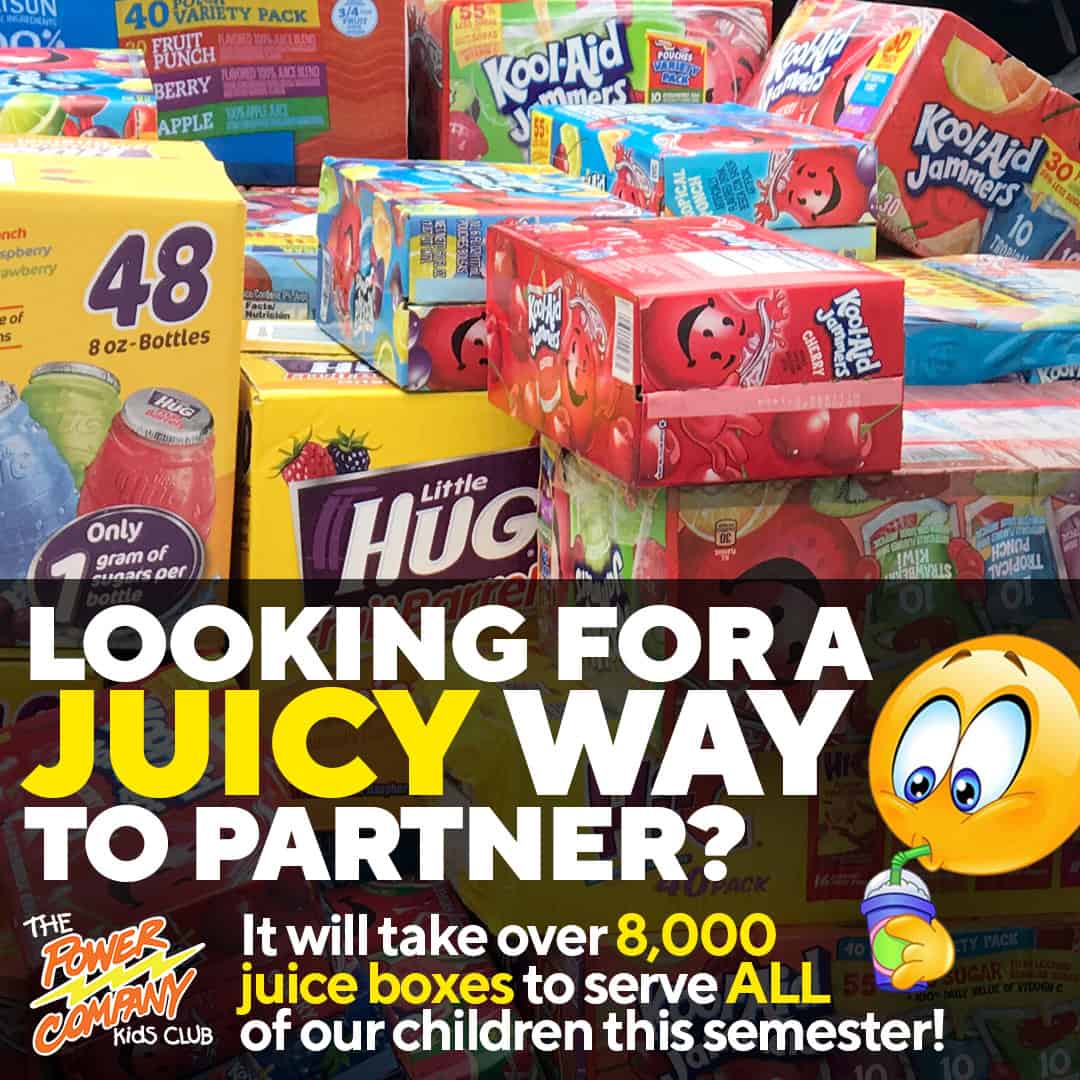 We’re “powered” by passionate people committed to building champions through in kind giving. Saturday Meals Juice Boxes Water Candy Food Boxes for the Holidays
