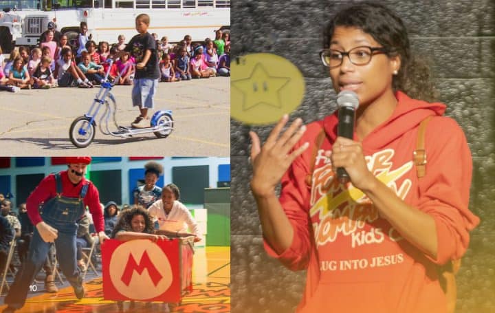 “The best day of my kid’s week!” We hear that a lot. And it’s no wonder. Each Saturday, we bus hundreds of grade-school kids to and from our gymnasium where they enjoy playing action-packed games, singing with a live band, and winning prizes — plus snacks, skits, and surprises! The “gateway” to all our programs, it’s where kids K through 5th grade receive a positive message to stay in school, stay off the streets, and stay close to God.